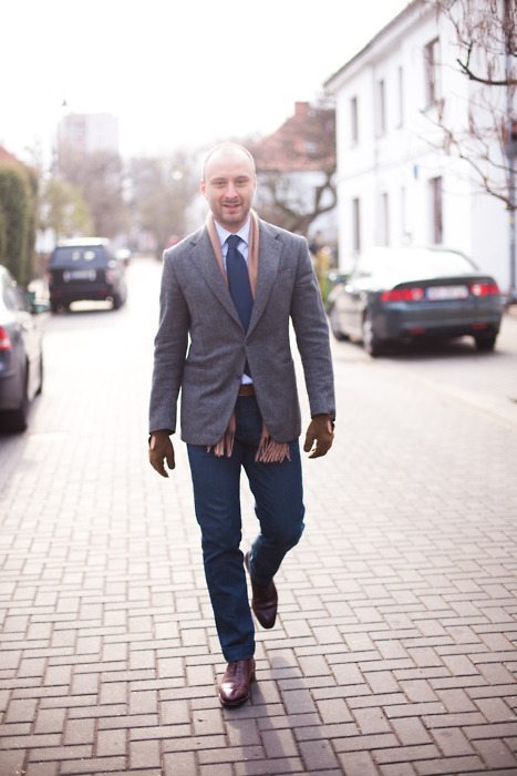 Para tornar essa combinação um pouco menos monótona, você pode usar uma gravata azul e sapatos de camurça marrom. Gosto muito da combinação abaixo, com tons de cinza diferentes. Tanto o paletó (com o detalhe dos bolsos estilo “patch”), quanto a calça e o sapato, tem um aspecto áspero (tweed, flanela e camurça). Ficou bem interessante!